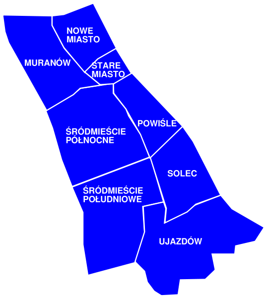 Muranów • Nowe Miasto • Powiśle • Solec • Stare Miasto • Śródmieście Południowe • Śródmieście Północne • Ujazdów |
