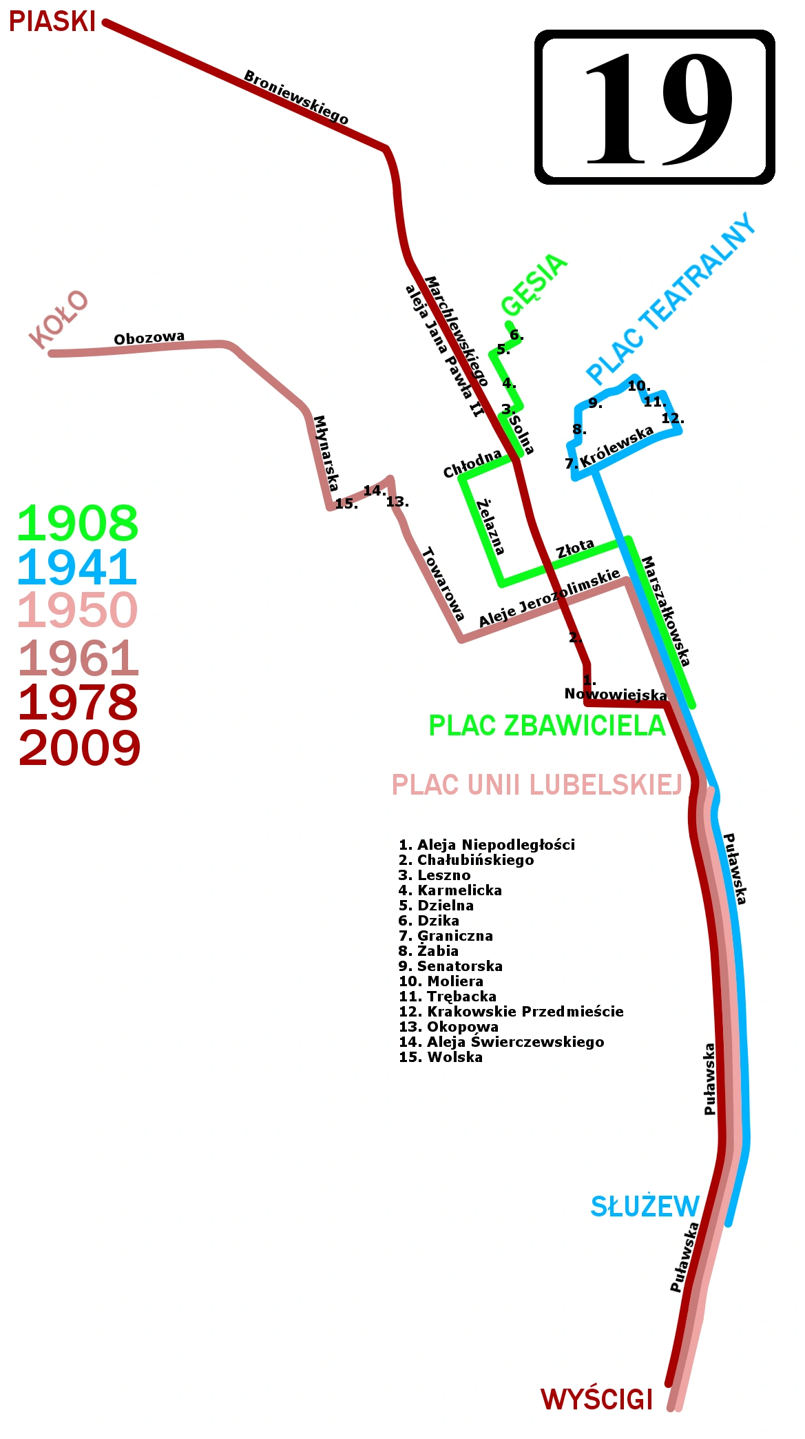 Schemat historycznych tras linii 19 (powiększ)
