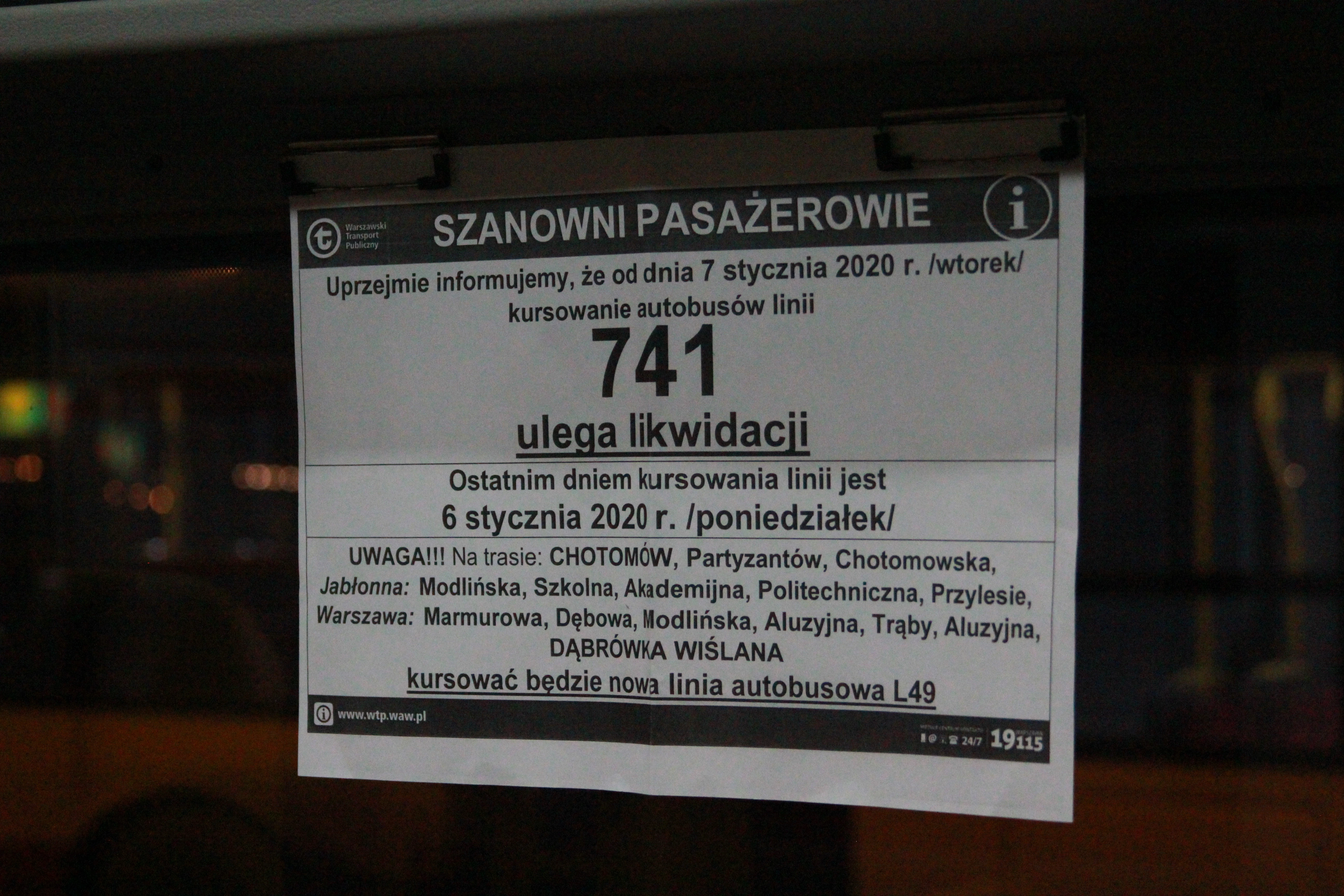 Ogłoszenie o likwidacji lini 741