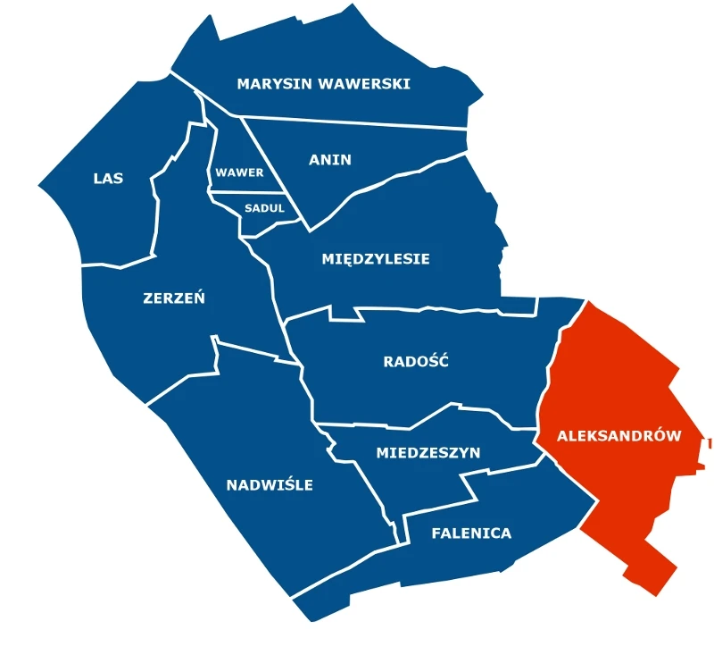 Aleksandrów • Anin • Falenica • Las • Marysin Wawerski • Miedzeszyn • Międzylesie • Nadwiśle • Radość • Sadul • Wawer • Zerzeń |