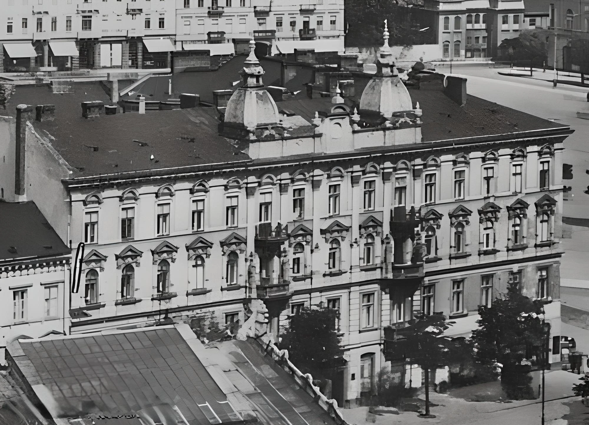 Kamienica powstała w latach 1851-1852 według projektu Alfonsa Kropiwnickiego jako dwupiętrowa kamienica z pięcioma środkowymi osiami wyróżnionymi pilastrami, zakończonymi na szczycie elewacji balustradą z rzeźbami. Na przełomie XIX i XX wieku kamienica została nadbudowana o jedno piętro, zaś środkową część budynku zwieńczono balustradą umieszczoną przed dwoma niewielkimi hełmami.