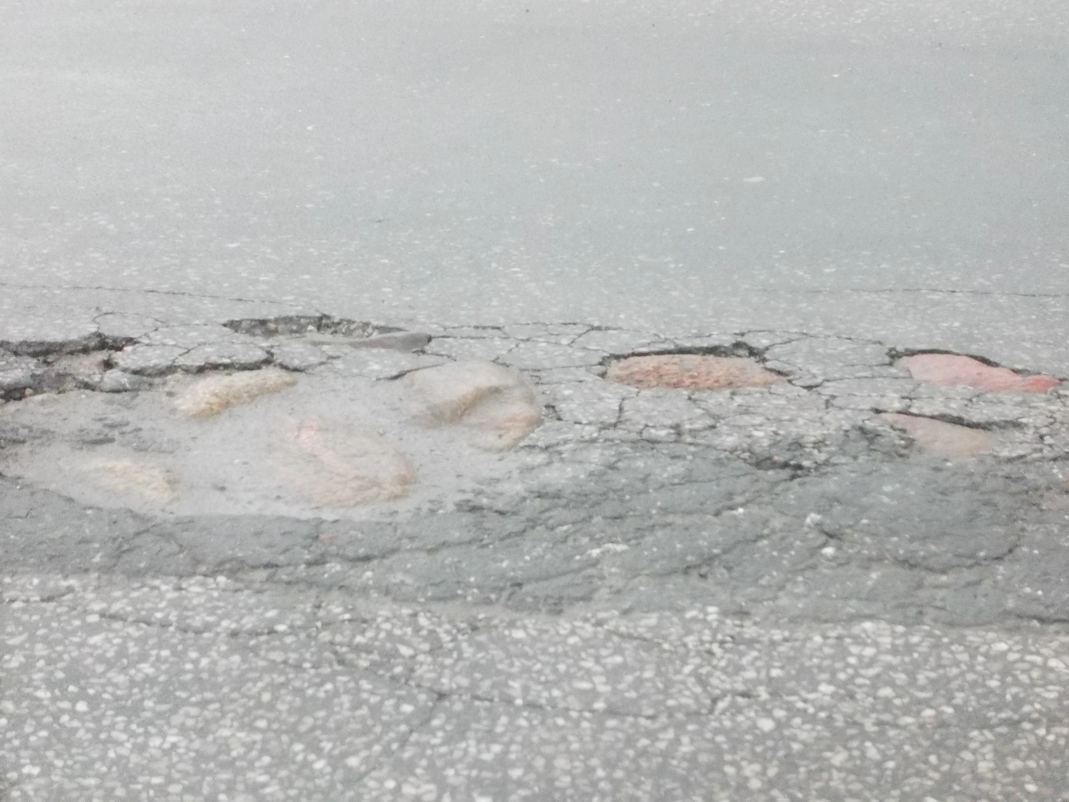Dawny bruk wystający spod zniszczonej warstwy asfaltu