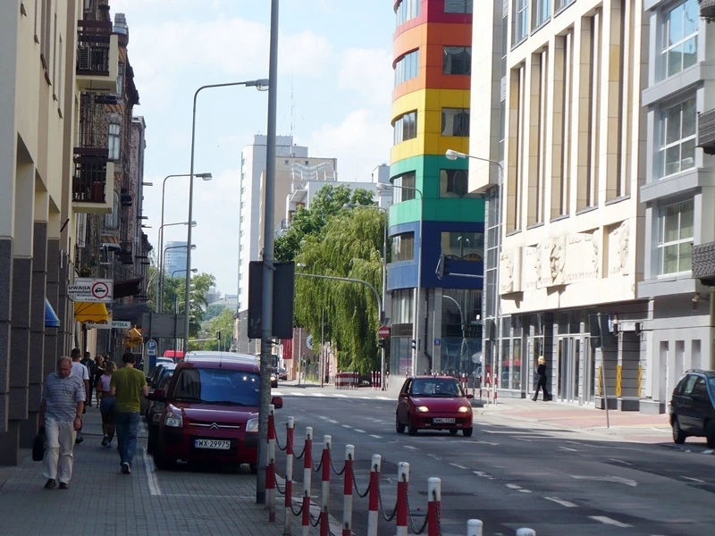 - róg Okrzei, Jagiellońska 15 – Rainbow Center, siedziba Urzędu Skarbowego, dawny Powszechny Dom Towarowy