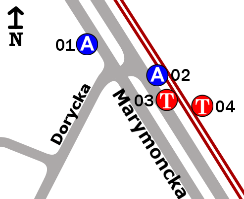 Przystanki 02 (po prawej) oraz 03 (po lewej) – widoczna dawna wiata typu "Stolica"