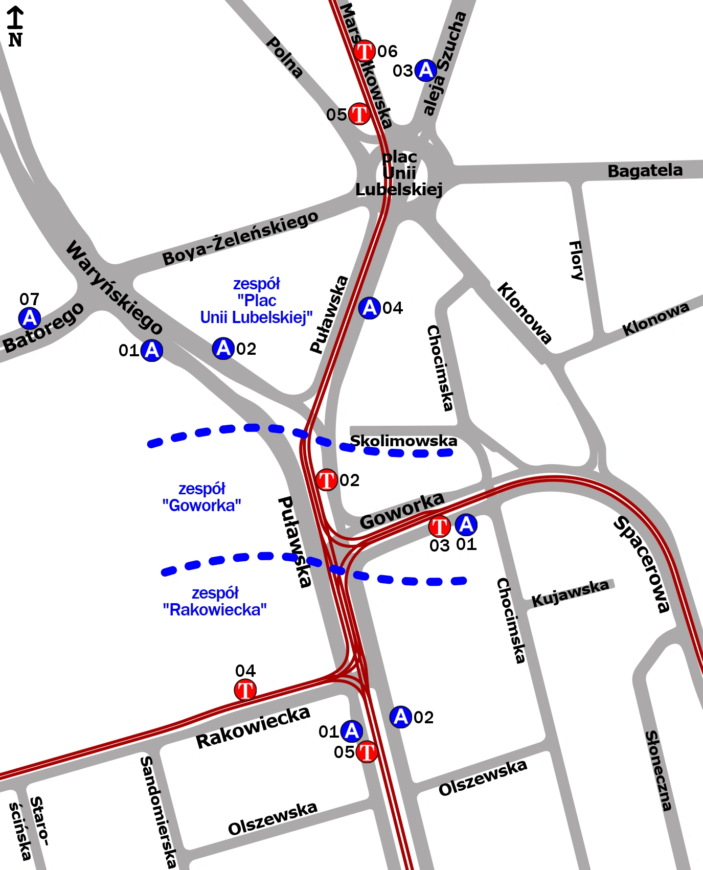 Schemat rozmieszczenia przystanków w zespołach „Plac Unii Lubelskiej”, „Goworka” i „Rakowiecka”