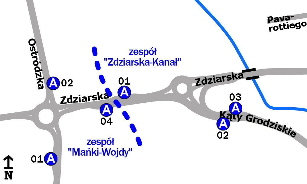 Schemat rozmieszczenia przystanków w zespołach „Mańki-Wojdy” i „Zdziarska-Kanał”