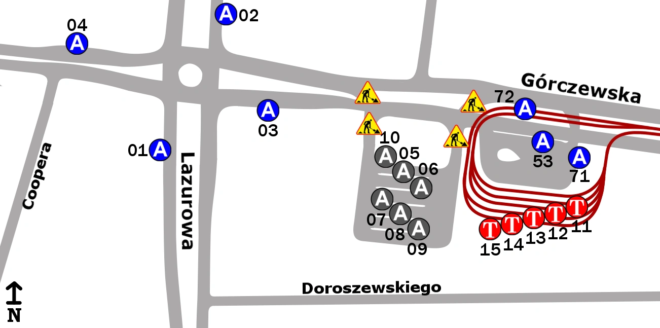 Przystanki oznaczone numerami od nr 01 do nr 04 to przystanki autobusowe na skrzyżowaniu ul. Lazurowej z ul. Górczewską, oznaczone numerami od nr 05 do nr 10 to autobusowe przystanki krańcowe w pętli, a te oznaczone numerami od nr 11 do nr 15 to tramwajowe przystanki krańcowe również położone w pętli.