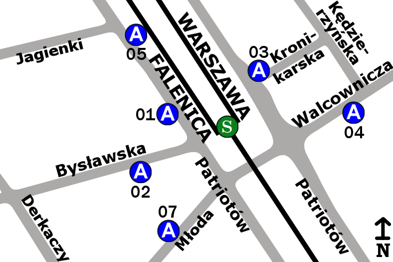 Schemat rozmieszczenia przystanków w zespole PKP Falenica