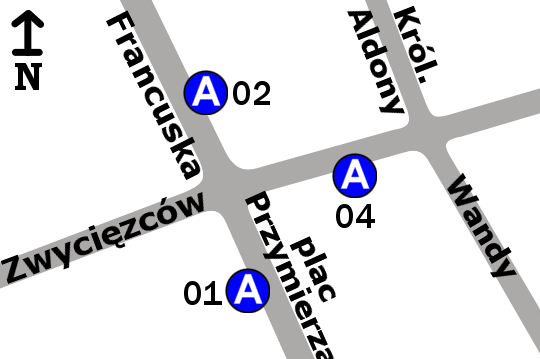 Przystanek znajduje się na pl. Przymierza, w pobliżu skrzyżowania z ul. Zwycięzców i ul. Francuska. W 2010 roku zespół przebudowano, a przystanek Wandy 02 przemianowano na dzisiejszy Plac Przymierza 04.