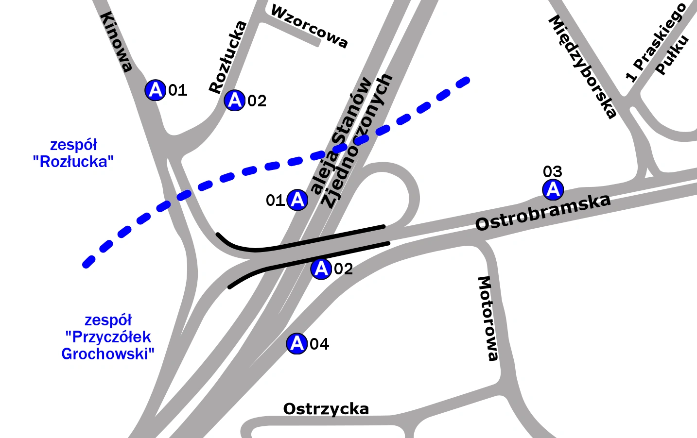 Schemat rozmieszczenia przystanków w zespołach „Przyczółek Grochowski” i „Rozłucka”