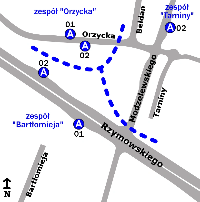 Schemat rozmieszczenia przystanków w zespołach "Bartłomieja", "Orzycka" oraz "Tarniny"