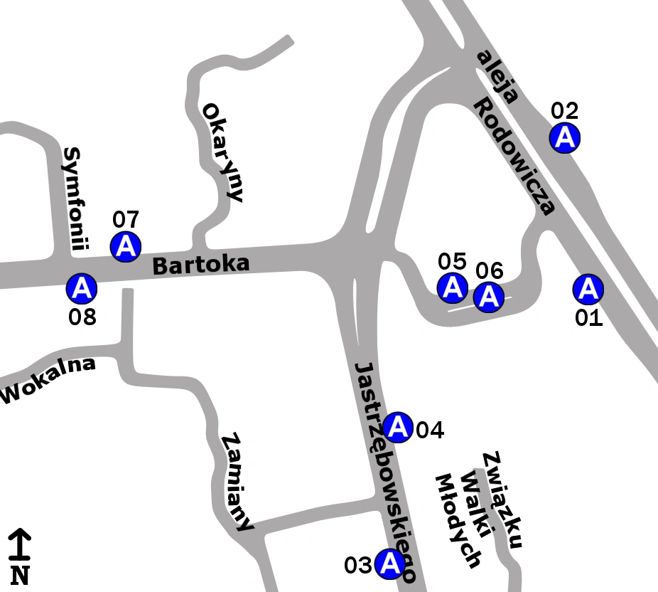 Schemat rozmieszczenia przystanków w zespole „Ursynów Północny”