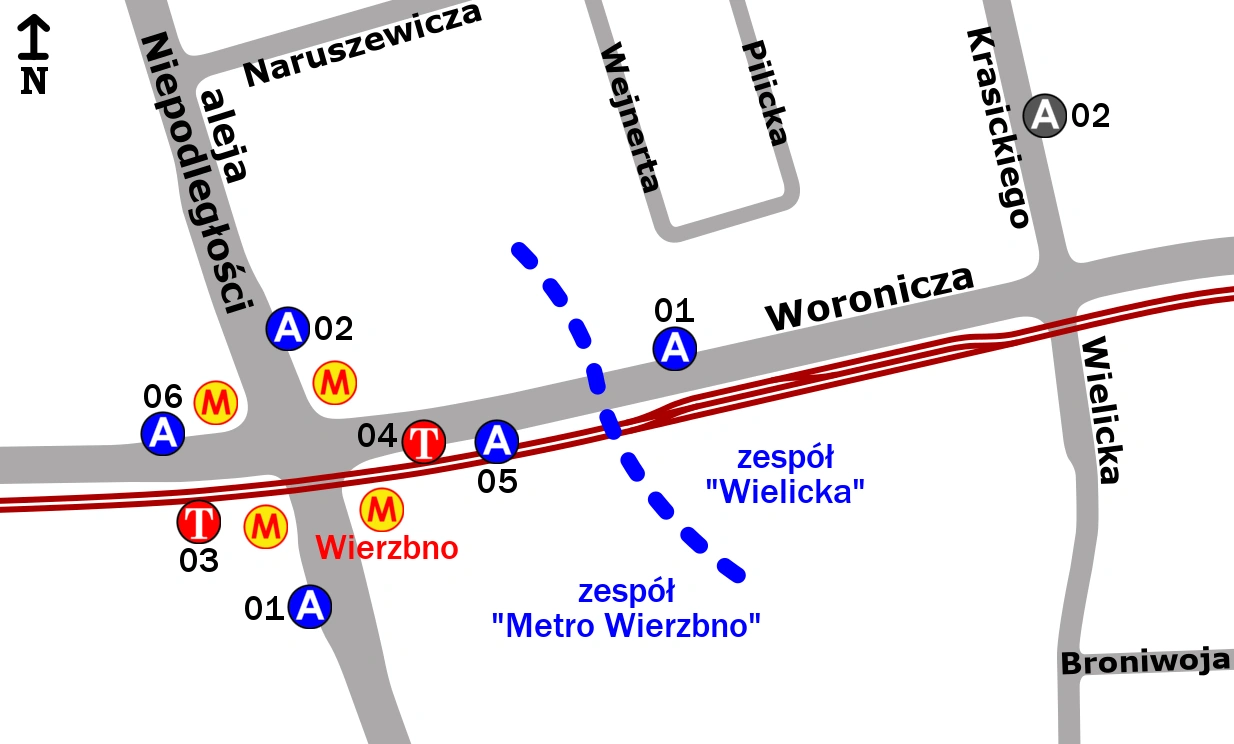 Schemat rozmieszczenia przystanków w zespołach „Metro Wierzbno” i „Wielicka”
